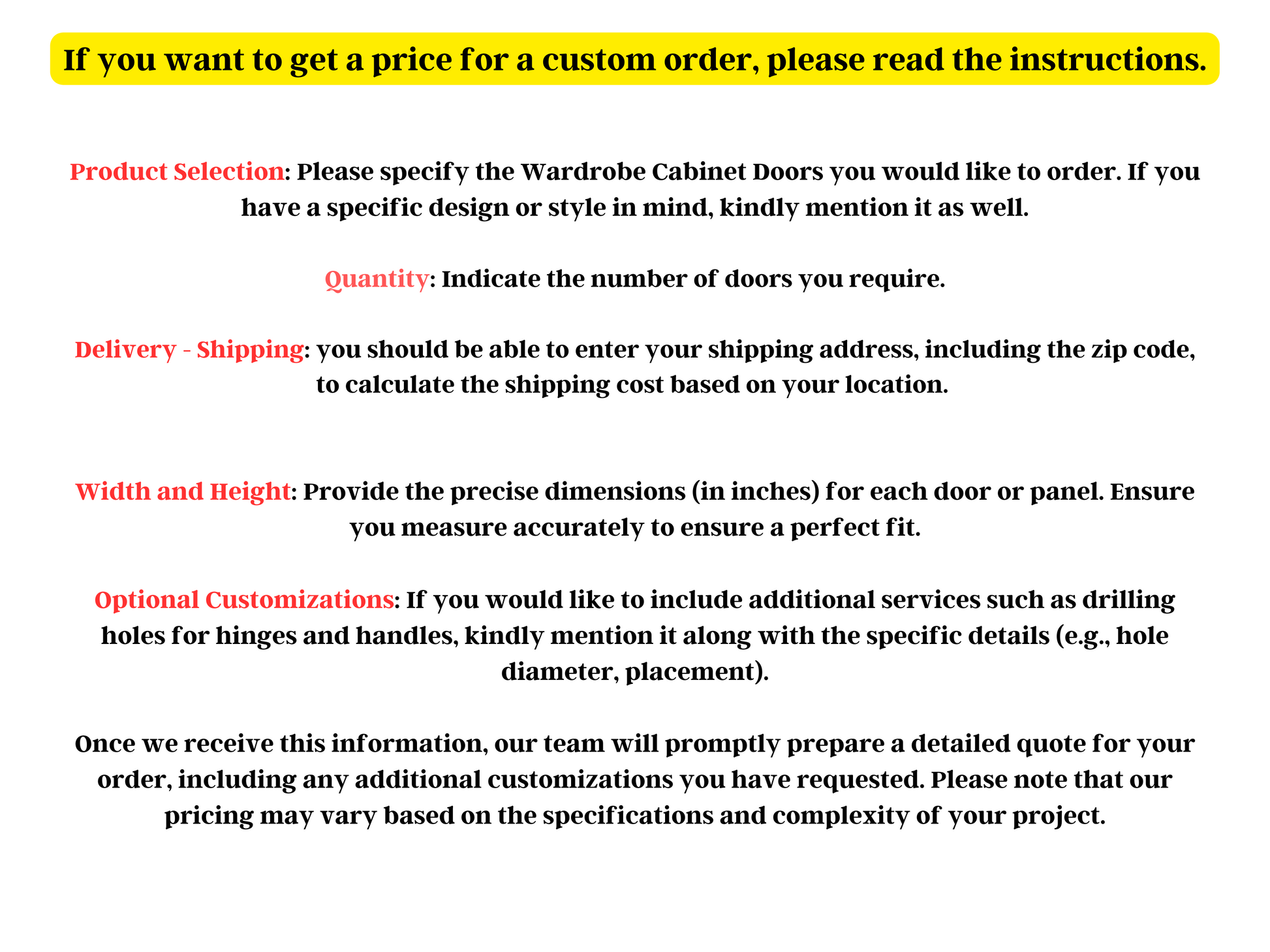We offer an additional service of creating holes for hinges and handles for our Wardrobe & Closet Doors. This customization allows for easy installation and seamless integration of hardware into your closet design for additional price.
